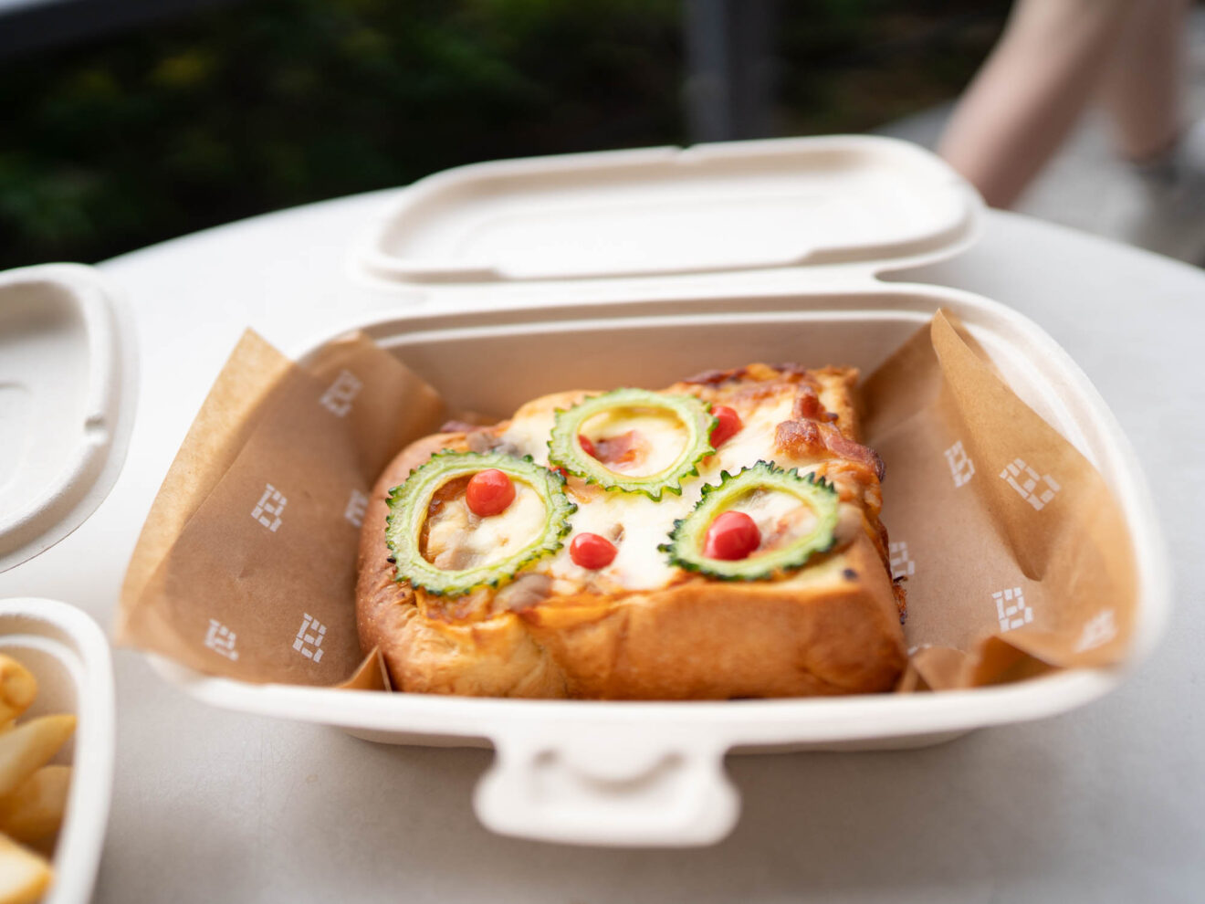 分厚いトーストにたっぷりのチーズ、ゴーヤーの苦みとスイティードロップのピリッとしたアクセントがクセになるトースト。