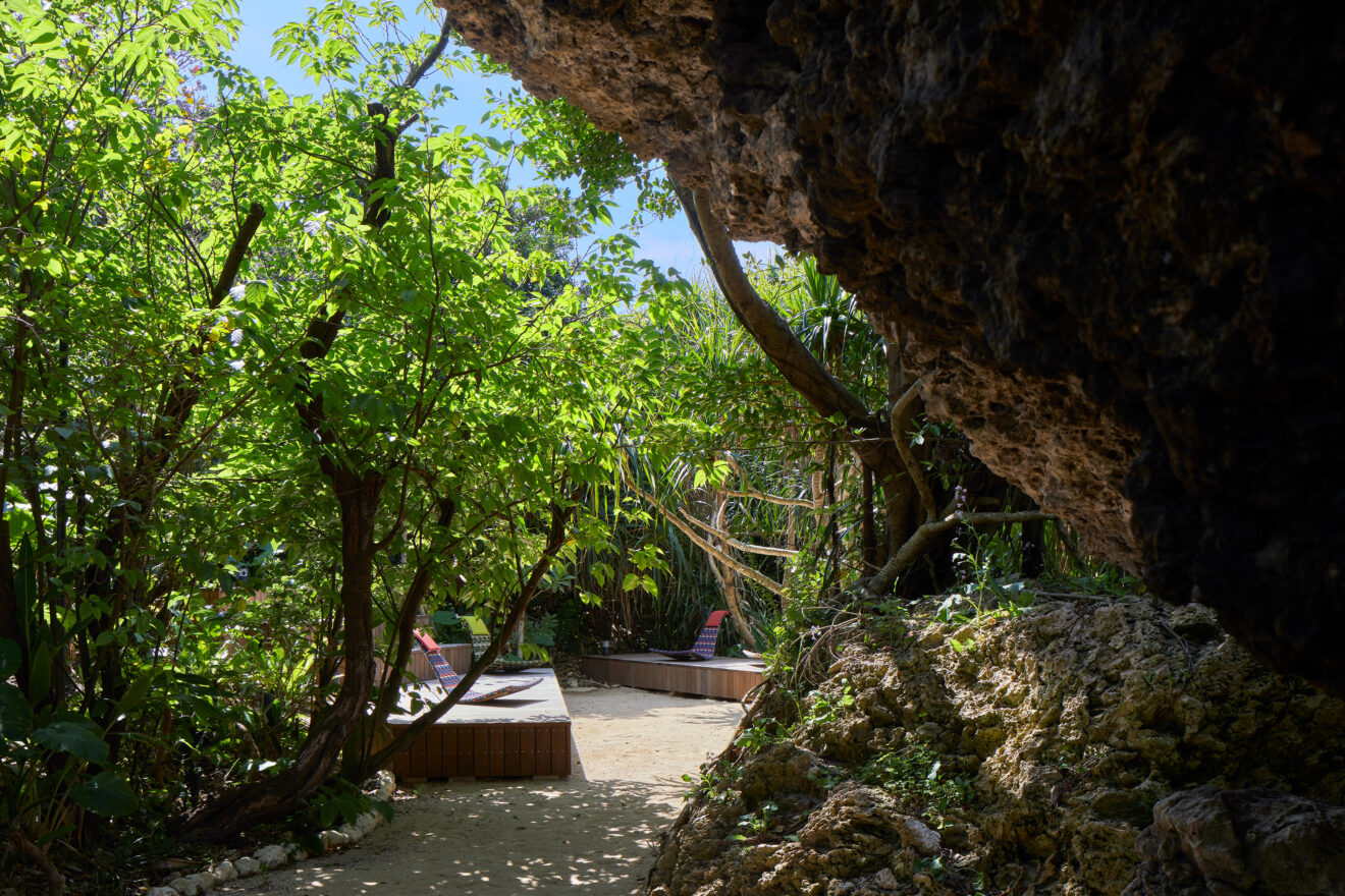 岩場のテラスは、まるで秘密基地のようなワクワクする空間。